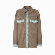 Design camicia over, modello in camoscio impreziosito con passamanerie stile indie e borchie raffinate sulle giunture del modello, chiusura con automatici, tasche frontali.