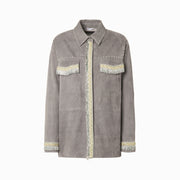 Design camicia over, modello in camoscio impreziosito con passamanerie stile indie e borchie raffinate sulle giunture del modello, chiusura con automatici, tasche frontali.
