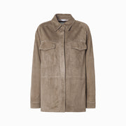 Design camicia over, modello in camoscio impreziosito con borchiette raffinate sulle giunture del modello, chiusura con automatici, tasche frontali.