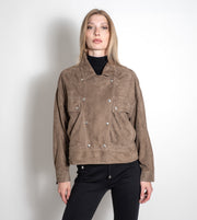 Design Blouson, modello in camoscio con frangie sul dorso e maniche, chiusura con automatici tasche e laterali.