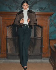 Design Cropped bomber jacket, sheepskin model, zip closure and side pockets.
